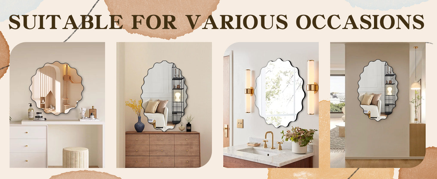 - HIGH-QUALITY MATERIALS: This shaped mirror is made of a 5mm lead-free and copper-free mirror and a 9mm black density board, which could present a clear reflection. The size of this asymmetrical mirror is about 23"*35"